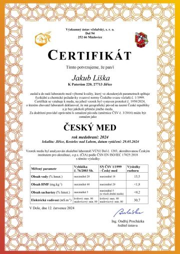 S hrdostí vám oznamujeme, že náš med získává pravidelně certifikáty kvality od Včelařského ústavu v Dole. Tento certifikát je důkazem vysoké kvality a čistoty našeho medu, který vyrábíme s láskou a péčí.
