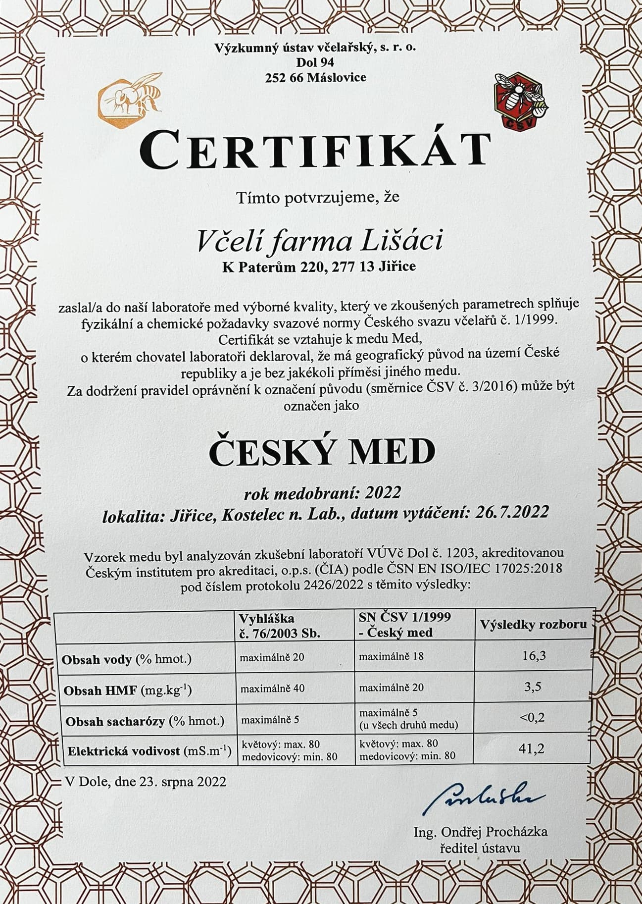 S hrdostí vám oznamujeme, že náš med získává pravidelně certifikáty kvality od Včelařského ústavu v Dole. Tento certifikát je důkazem vysoké kvality a čistoty našeho medu, který vyrábíme s láskou a péčí.